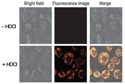 與HOCl反應(yīng)產(chǎn)生強(qiáng)烈熒光。專一性高,背景低;用于生物樣品中HOCl含量的測(cè)量與熒光成像;用于Myeloperoxidase (neutrophils) 的活性研究.